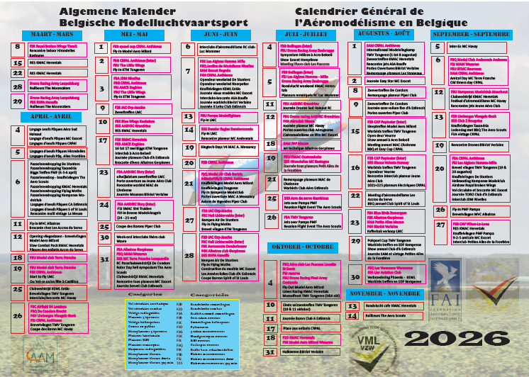 The 2026 General Aeromodelling calendar is available in pdf format. It includes all regional events like shows, etc. Ready for printing as a poster in A2 format, thanks to Willy De Maertelaere